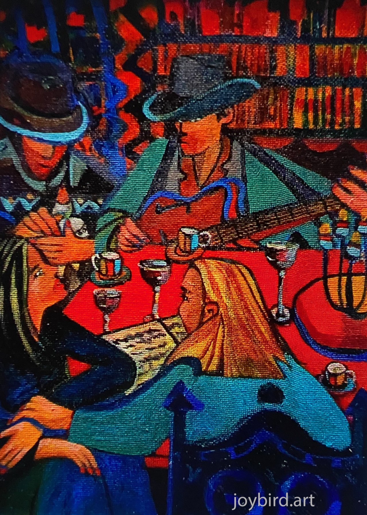 Rich intense hues dominate this painting creating a warm and dynamic atmosphere. The style is expressionistic with distorted proportions and the focus being on colour and pattern. It is set in a domestic situation inviting the viewer a look into a moment of shared musical experience.