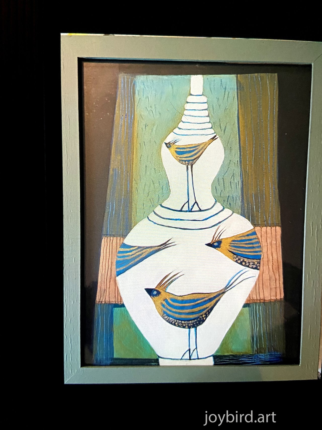 A quiet yet striking depiction of a vase with porcelain like surface. Elegant birds carry a sense of flight suggesting a relationship between stillness and motion. A fusion of nature, form and imagination.