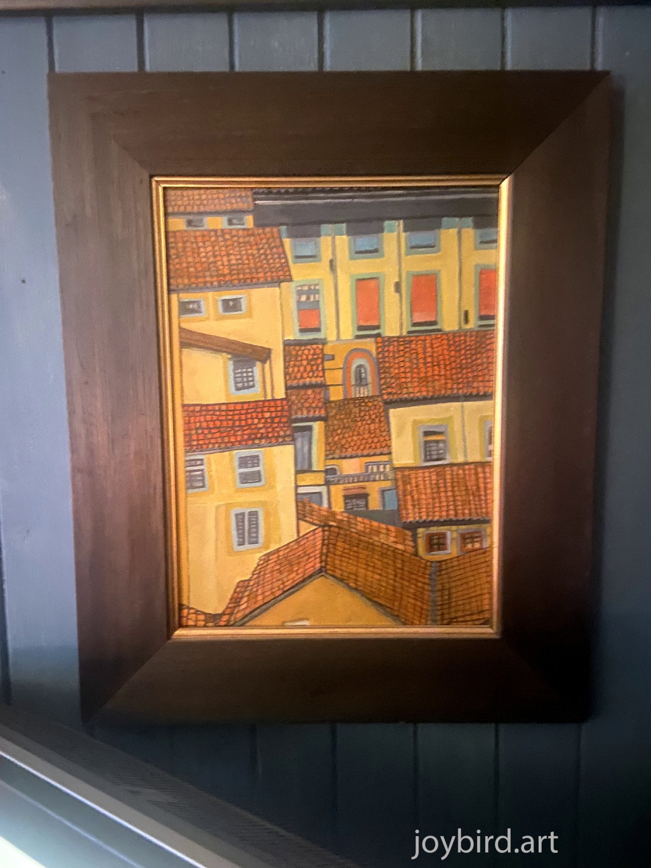 A stylised painting of buildings in Bologna in a dominantly warm palette of ochres yellows and terracotta giving it a sunlit atmosphere. There are small shuttered windows and doors in blues and greys contrasting with the terracotta roof tiles. The buildings are overlapping in a flattened abstract manner giving a maze like appearance.