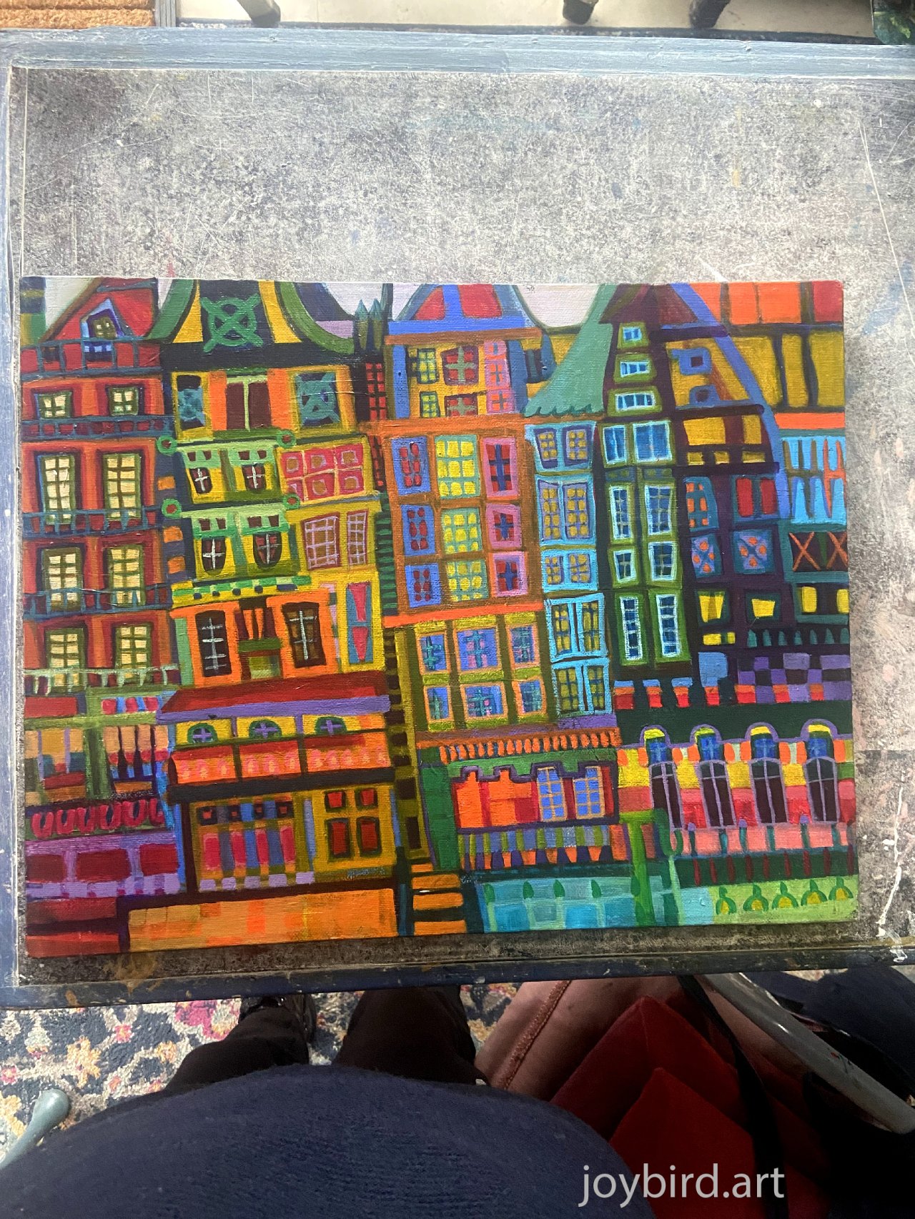 This painting shows tall narrow buildings huddled together with a distorted perspective. There is an extremely bright palette of colours in a very stylised form depicting a variety of gables and windows.The entire canvas is densely filled and the whimsical visual intensity explodes with colour and pattern.