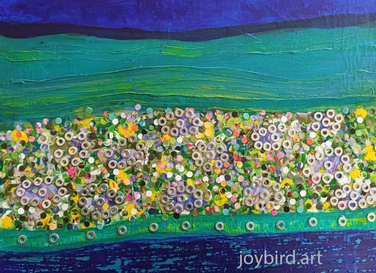 Meadowsweet bursts with texture, pattern and colour. The deep indigo evokes a night sky at the top third of the composition while the bottom layer suggests moving water. Clusters of metallic rings add an industrial dimension to this otherwise naturalistic scene. This is about soft versus sharp -nature versus construct.