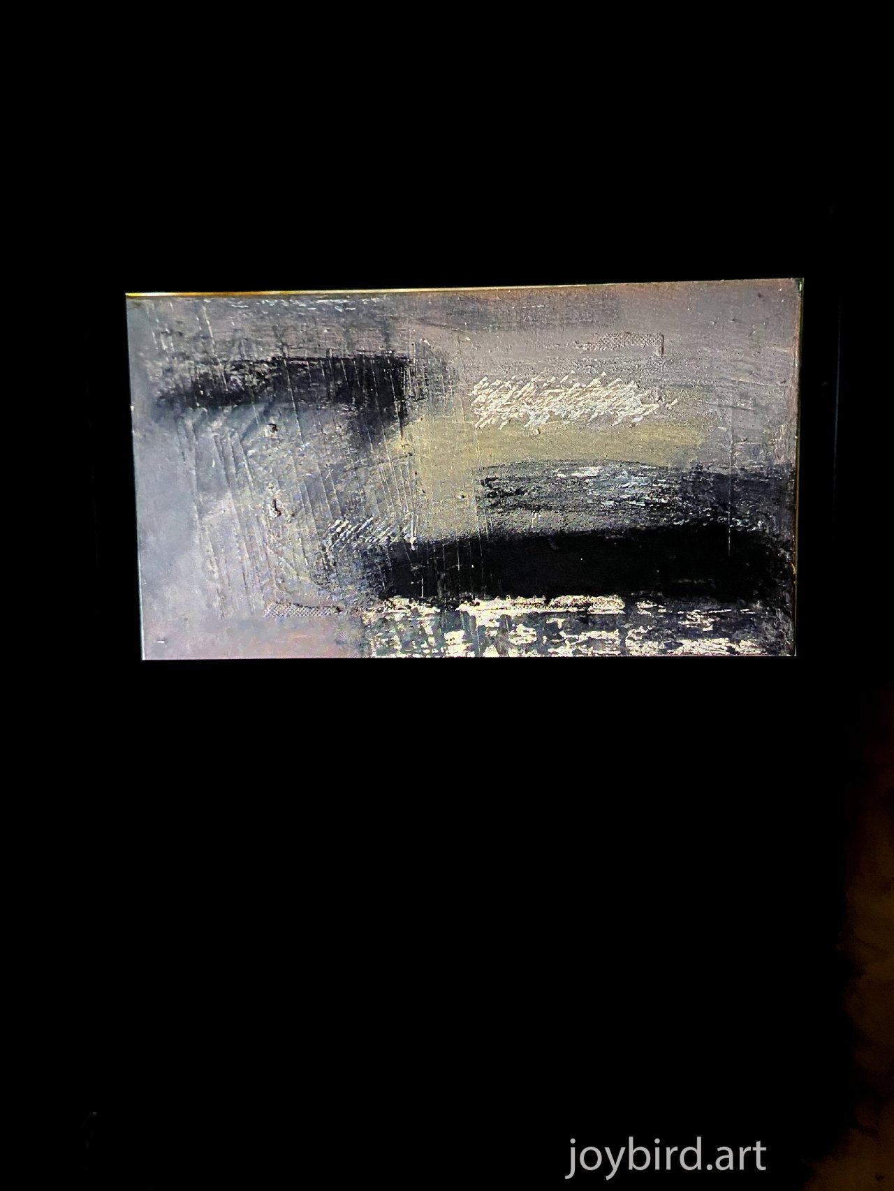 An Impasto texture and restrained palette evoke an atmospheric tension of a windswept landscape. Pale whites ochres and leaden greys blur the lines between land and sky. The abstract expressionist technique give the work a meditative stillness that rewards contemplation.