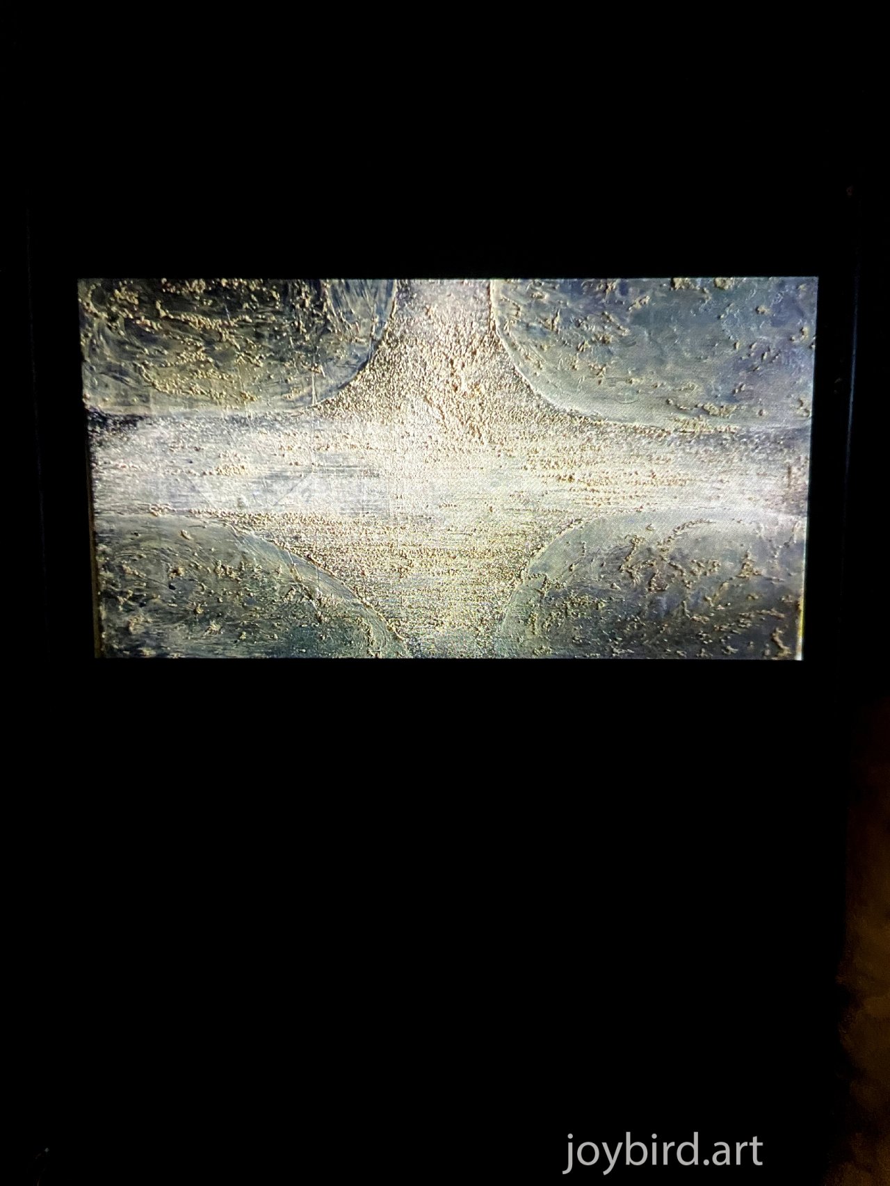 A contemplative abstract work evoking themes of transcendence and balance. The shadowy curved form imbues the piece with quiet dynamism suggesting ancient terrain anchoring the work in both the cosmic and the spiritual.