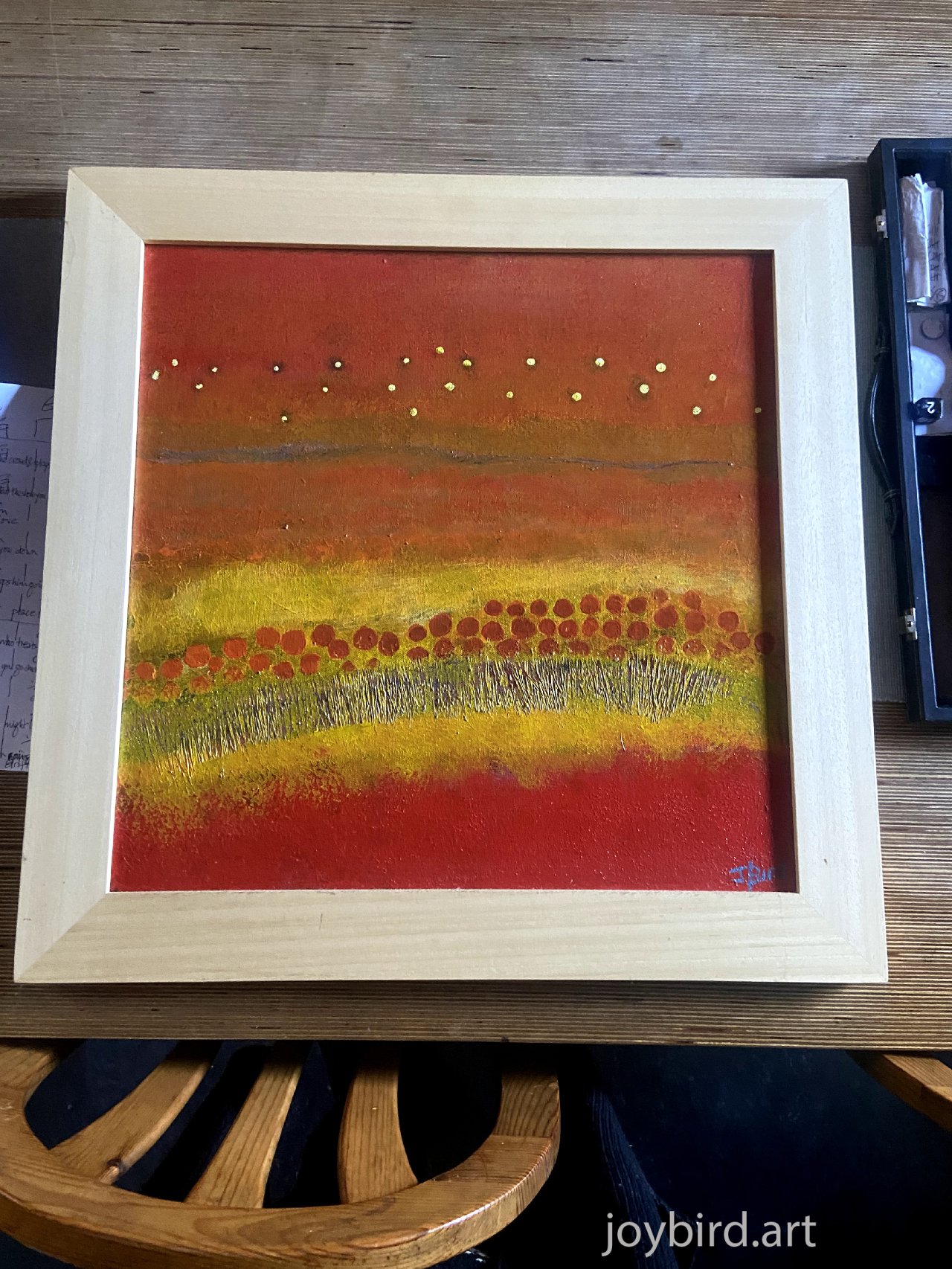 A vibrant abstracted landscape that captures the essence of energy within natures banded layers. The base is a rich red-orange earth tone rising into a vivid band of yellowish grass. Dots of metallic gold float above the horizon suggestive of seeds or pollen.