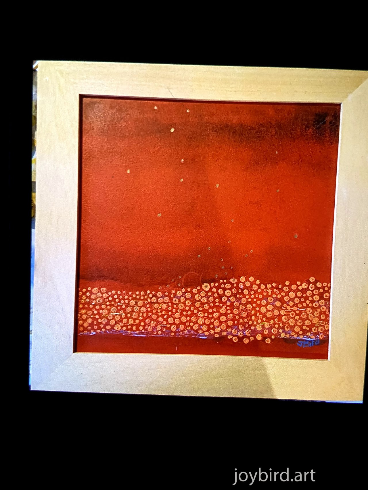 Visceral and striking composition evokes an abstracted swarm of life. The top and bottom parts of the painting create a tranquil frame of smooth red tones allowing the richly textured middle to stand out as the work’s emotional and visual heart.