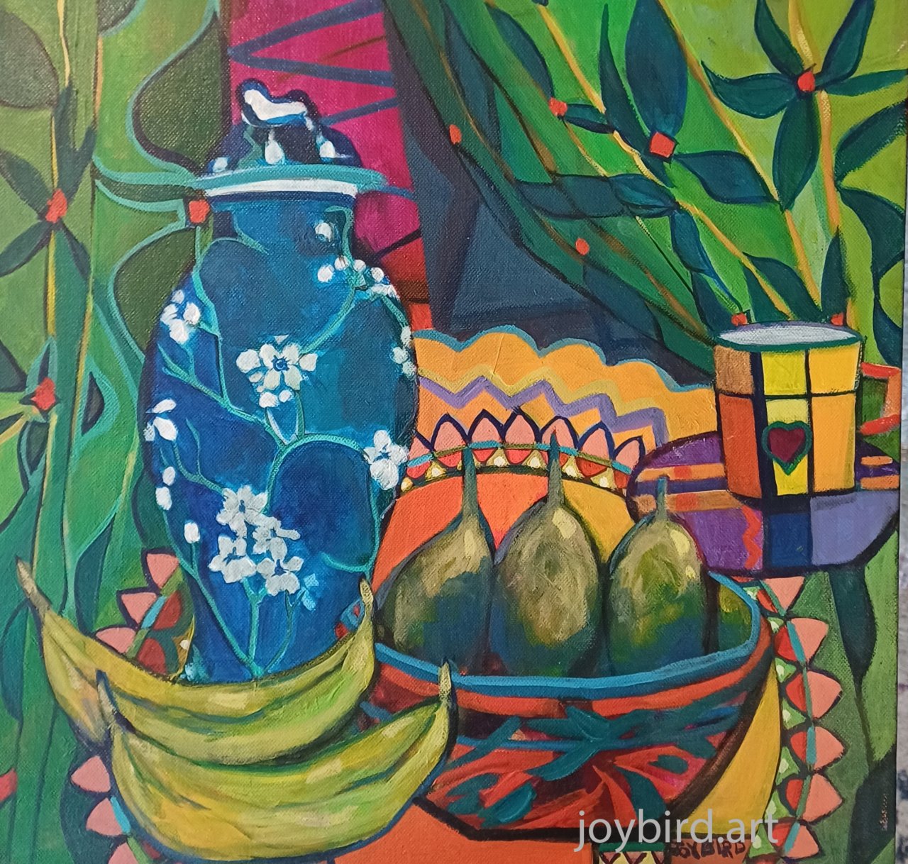 Stylised still life dominated by a large deep blue ceramic vase to the left of the composition with 2 bananas. In the foreground, a bowl containing 3 green fruits. To the right sits a small cup and saucer. The background is filled by highly patterned green fabric. The use of flattened planes, bold outlines and strong contrasting colours makes this is a highly energetic work.