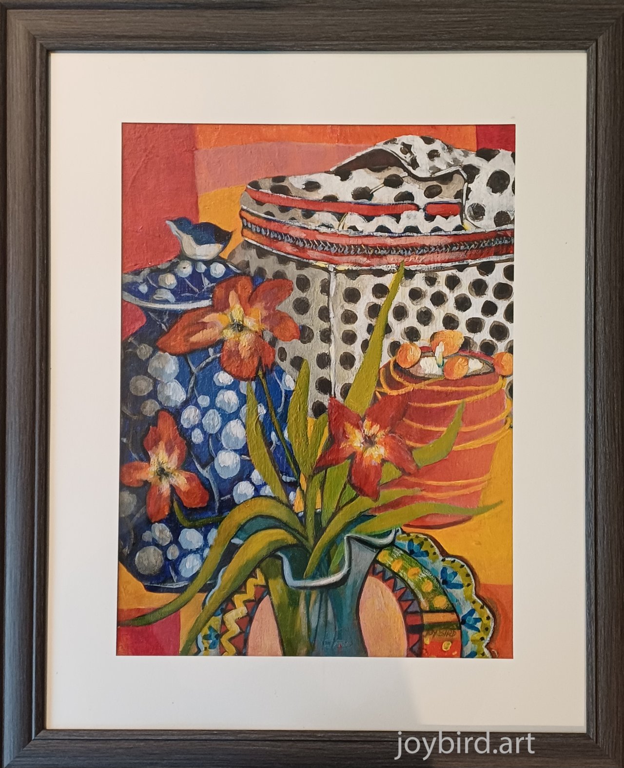 A still-life featuring decorative ceramic vases and large vivid flowers. Dominated by warm tones of red orange, and cool blues with a polka dot pattern offering sharp contrast. It is expressive and boldly stylised making it both decorative and energetic.