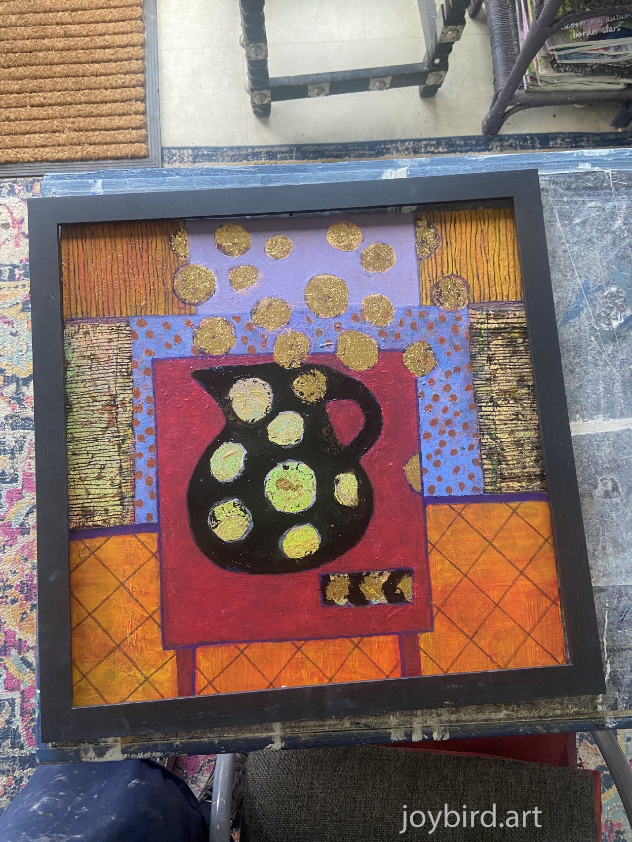A large black pitcher takes central place in a highly stylised still life. The shape is simple and boldThis work uses metallic gold circles and flattened planes to produce a patchwork aesthetic. There are rich textures differentiating each block, the use use of lines and grids compartmentalising the composition.